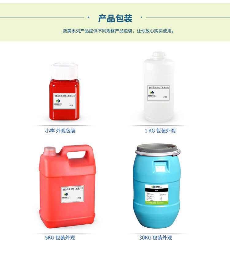 奕美系列印花涂料色漿是由高級有機顏料與助劑和水為溶劑組成的高度分散的顏料固體懸浮體。品種為