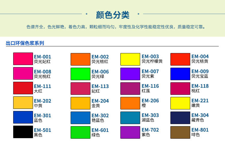 奕美牌印花涂料色漿是由優(yōu)質(zhì)顏料、助劑和水制成的高度分散的顏料懸浮液。