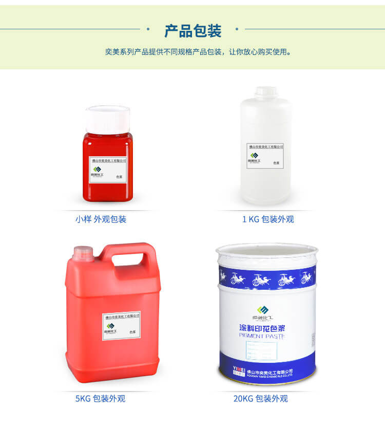 奕美牌印花涂料色漿是由優(yōu)質(zhì)顏料、助劑和水制成的高度分散的顏料懸浮液。